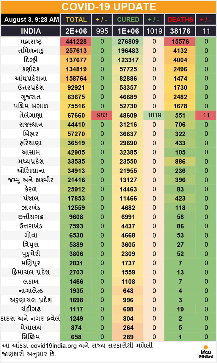 In Gujarat, 1,101 new cases were registered on Sunday, bringing the total number of corona cases in the state to 63,675. As many as 23,255 tests were conducted across the state on Sunday and the number of positive cases against the test is just under 5 per cent, while the total number of cases registered against testing of 8,14,335 samples so far is about 8 per 8. St. However, in May and June the proportion was around ten per cent.